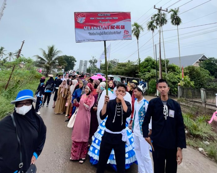 Tanjung Jabung Timur [18/08/2025] – Ratusan masyarakat tumpah ruah di sepanjang jalan Kecamatan Rantau Rasau pada Senin (18/8) untuk menyaksikan pawai pembangunan dalam rangka memperingati Hari Ulang Tahun Kemerdekaan Republik Indonesia ke-80. Pawai dimulai dari Lapangan MM SK 16 Kelurahan Bandar Jaya dan berakhir di Lapangan Kecamatan Rantau Rasau, tepatnya di SK 10 Kelurahan Bandar Jaya.